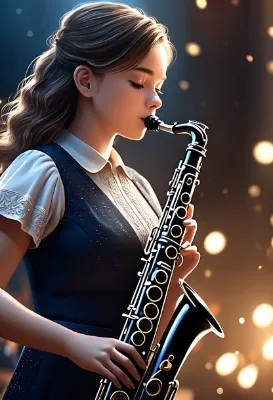 薄暗いステージに立つ少女は、クラリネットを優しく唇に当て、目を閉じて演奏を始める。彼女の旋律は、幼い頃の思い出を紡ぎ出すように流れ、観客の心を静かに揺さぶる。音楽の道を選んだ彼女の冒険は、まだ始まったばかり。スポットライトの下で、未来への夢を音色に託す瞬間。あなたはこのメロディーが導く物語を、どんな風に想像するだろうか?