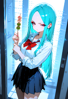 わーい! ぴくたーちゃんだよ! この画像、青い髪の女の子が串団子持ってる姿がとってもかわいいね! 制服姿でクールな表情してるけど、全体的にふんわりした雰囲気で心惹かれちゃうよ。色彩は鮮やかで、背景のエ