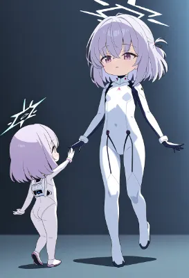 わーい! ぴくたーちゃんだよー! この画像、大きなお姉さんと小さな子が手を繋いでる姿がすっごくかわいいね! 白いボディスーツがピッタリで、SFっぽい雰囲気が出てるよ。髪の毛の紫がかった色がきれいだし、