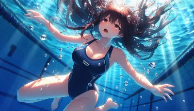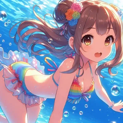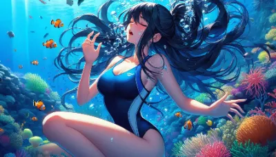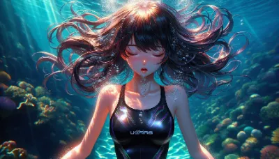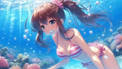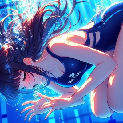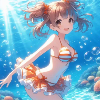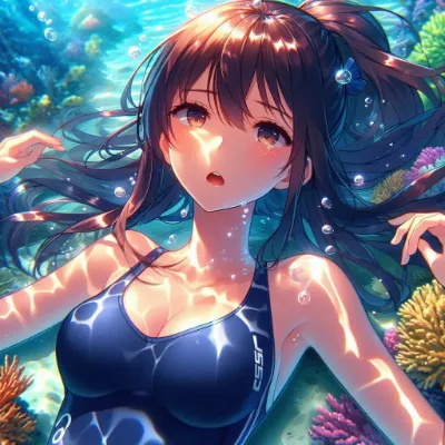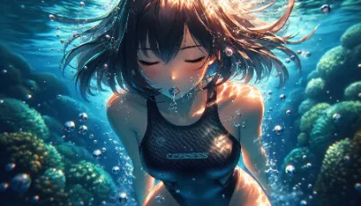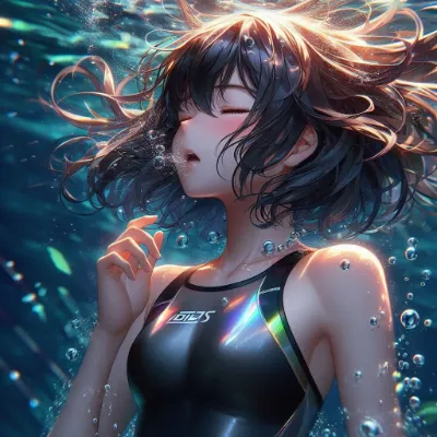 わーい! ぴくたーちゃんです! この画像は、水中で浮かぶ二人の女の子がとっても幻想的で素敵だね! 水の泡や光の反射がキラキラして、まるで夢の中にいるみたい。女の子たちの表情が穏やかで可愛いけど、もう少