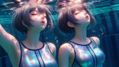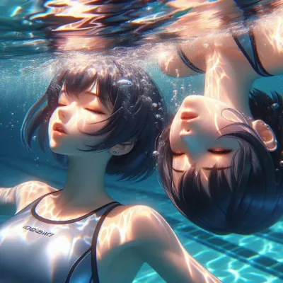 A detailed anime-style close-up image of two girls of Asian descent floating face-up underwater. The image captures their upper torso and face. Their short hair moves around their in the water. They are exhaling with some bubbles escaping from their mouth. They wear a sleek competitive metallic silver swimsuit. The lighting reflects the underwater environment with vibrant dappled light patterns reflecting off their skin. They close eyes. They are completely upside down.