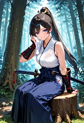 小隊が参道を進む。 隊長が人影を見つけ声をかける。 「少女よ、そこで何をしている」 「この先に何か用でも?」 隊長は一瞬迷ったが、 「この先にもののけが居るというので討伐に向かうのだ。危ないから帰りなさい」 「そういう事なら尚更この先にはいかせられない…」 そう言って少女は刀を抜いた。 「もののけに与するのであれば致し方あるまい」 そう言って切りかかったが… 「見た目で判断するのはよくないぞ…」 そういうと本来の鬼の姿に変わっていき応戦する。 大勢が決するのに時間はかからなかった。 「さて、どうすどうする?」 討伐隊は半数以上が殺られ残されたものは戦意を失っていた・・・ 一人が敗走すると連れて残されたものは蜘蛛の子を散らすように逃げて行った。 「今日はこの先で姫様が儀式の際中の故にな」 そう言って彼女は刀に手を置きニヤリと笑った。 ↓インスピレーションを受けた作品 ここは通さない ひろひろさんの作品 https://www.aipictors.com/posts/661288 この娘鬼の角似合いそう。と思って急遽制作しました。