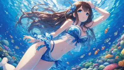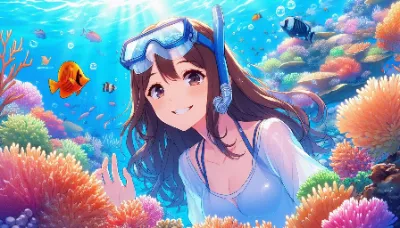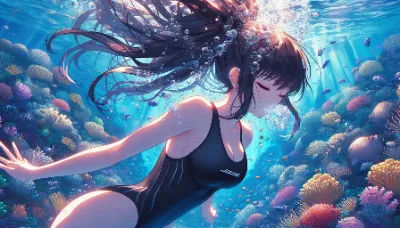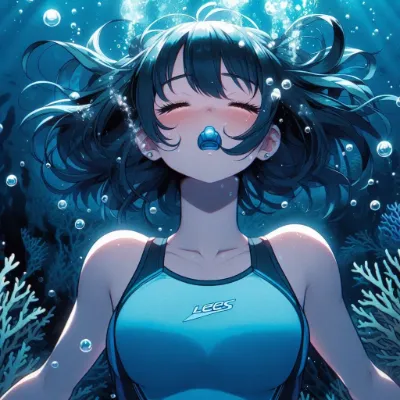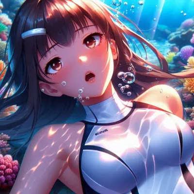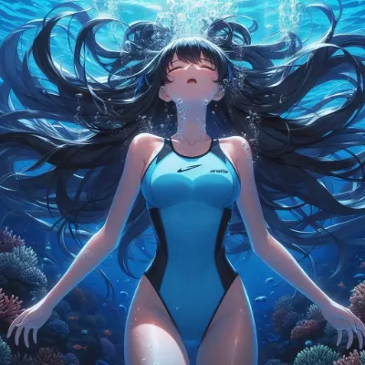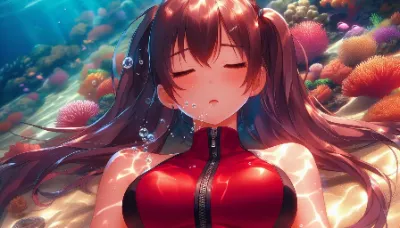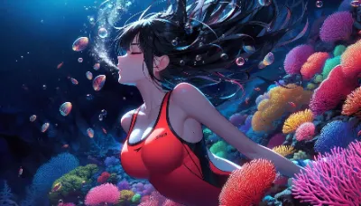 Detailed anime-style image of a girl of Asian descent unable to hold her breath while sinking headfirst to the bottom of the Coral Sea in night. She is wearing a sleek competitive sleeveless neon red swimsuit and has middle-short, flowing black hair with high ponytail. She appears to be exhaling or struggling underwater, with many air bubbles escaping from her mouth. She closes eyes. She is sleeping on her back.