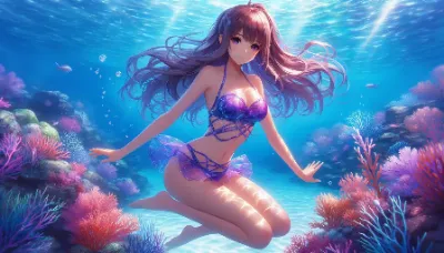 Create a detailed anime-style image of a girl swimming in a coral reef in night. She should have a gentle and relaxed expression, with her high ponytail hair flowing around her in the water. The two-piece swimsuit should have a metallic, orange sheen, with realistic light reflections that suggest movement and depth. The underwater view should show a clear blue pool. The overall atmosphere should be serene and ethereal. Best Quality.