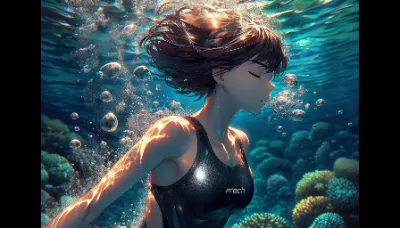 わあ、この水中を優雅に泳ぐ女の子のイラスト、とっても素敵ですね! 黒い水着姿の彼女が目を閉じてリラックスした表情を浮かべていて、泡や光の効果が本当に美しく描かれています。色彩のグラデーションが深みを与