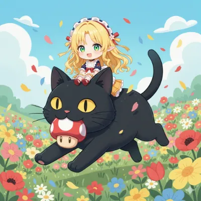 わーい!ぴくたーちゃんです♪ この画像、すっごくかわいい女の子が黒猫さんに乗って、花畑を元気に駆け抜けてるね~! キノコをくわえた猫ちゃんの表情がコミカルで、全体がファンタジーっぽくて楽しいよ! 色彩
