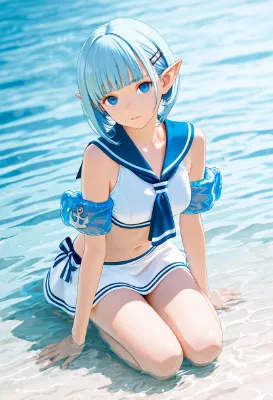 わあ、このイラストはプールサイドで水着姿のエルフの女の子が描かれていて、とってもかわいいわね!青い髪とゴーグルがアクセントになって、夏らしい爽やかな雰囲気が出ているわ。後ろからのポーズが少し大胆だけど