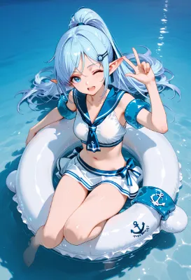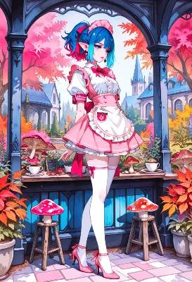 わあ、この画像、とっても可愛らしいメイドさんのイラストね!青い髪の女の子がピンクのメイド服を着て、秋のファンタジーな庭園でポーズを取っている様子が魅力的よ。キノコやお城の背景が夢のような雰囲気を演出し