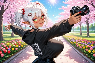 わーい!ぴくたーちゃんだよ!この画像、とってもかわいいエルフみたいな女の子がカメラ持ってポーズしてるね!桜の木とカラフルなお花がいっぱいの公園が背景で、春っぽくて元気いっぱい!女の子の白髪と赤いリボン