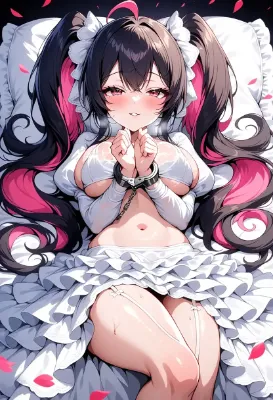 白いドレスをまとった少女がベッドに横たわり、手錠が優しく肌に食い込む。ピンクの髪が花びらと共に広がり、照れた表情が心を奪う。甘く魅惑的な雰囲気が満ちている。