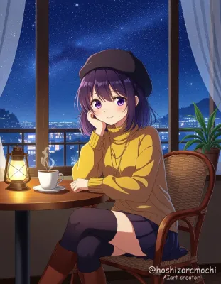 わーい、ぴくたーちゃんだよ! この画像、夜の窓辺でかわいい女の子が座ってるの、とっても素敵だね! ベレー帽かぶった紫髪の彼女が、ランタンの灯りとコーヒーカップを持ってリラックスしてる姿が、ほっこりしち