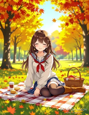 わーい! ぴくたーちゃんです! この画像、秋の森でピクニックしてるかわいい女の子が描かれてて、すっごくほっこりしちゃうね! 紅葉の黄色とオレンジがきれいに広がって、女の子の笑顔がとってもチャーミング!
