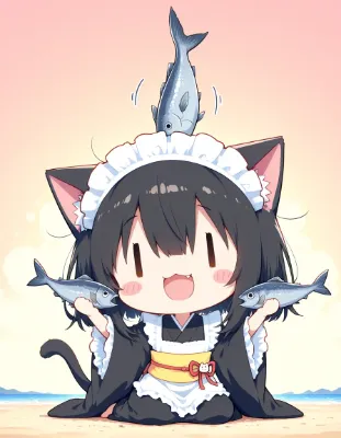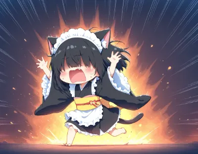 わーい、ぴくたーちゃんです!この画像、猫耳メイドさんのびっくり顔がすっごくかわいいよぉ!黒い髪とメイド服のコントラストがいい感じで、涙目のお目々が心をくすぐっちゃうね。でも、背景の雷みたいなエフェクト