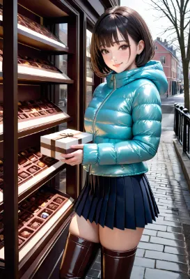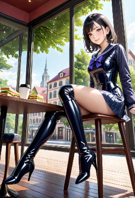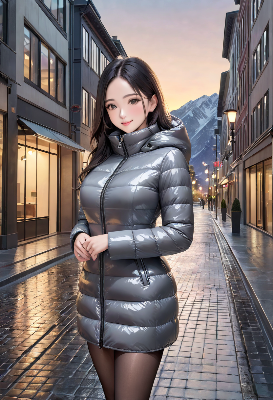 (photorealistic:1.4), (RAW photo), masterpiece, best quality, extremely detailed, lady, neat and clean, elegant, polite, (shy:0.9), black long ponytail hair, almond eyes, (smile:0.9), navy ribbon bow tie, slim fit, closed zipper, (translucent violet long sleeves puffer raincoat), (navy hooded sailor collar:1.3), pleated skirt, platform long rubber boots, standing pose, (high angle shot:0.6), cold rainy town, dark cloudy sky