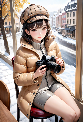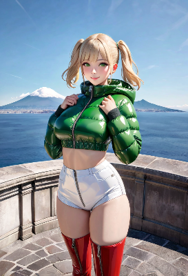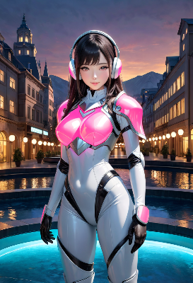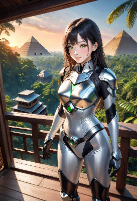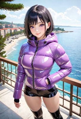 この画像は、雨の街路を背景にポニーテールの少女が紫の透明ジャケットを着て微笑む様子を描いたもので、アニメ調の3Dレンダリングが印象的だ。彼女の表情は魅力的で、雨の反射が街の雰囲気を美しく演出している。