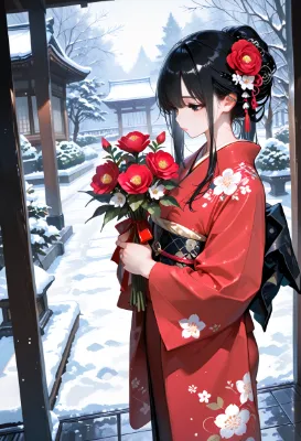 black hair, kimono, furisode, vibrant colors, braided bun hair,