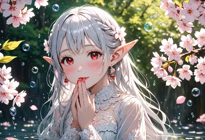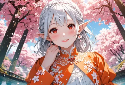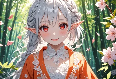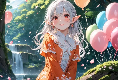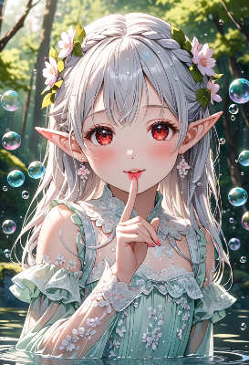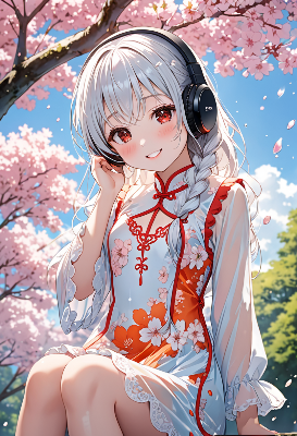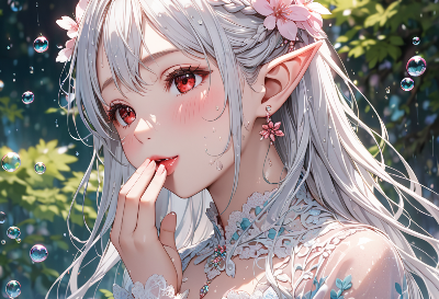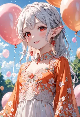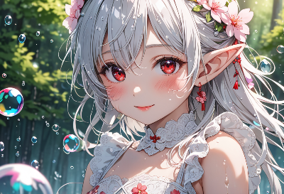 白銀の髪をなびかせ、エルフの少女がハイテクスーツに身を包み、薔薇の庭園に立つ。ヘッドホンから流れるメロディーに心を委ね、赤い瞳が輝く。彼女は未来の戦士か、それとも恋に落ちた夢想家か?周囲に舞うハートと薔薇の花びらが、甘い冒険の始まりを予感させる。音楽が導く未知の世界で、どんな出会いが待っているのだろうか。