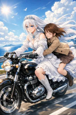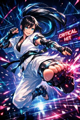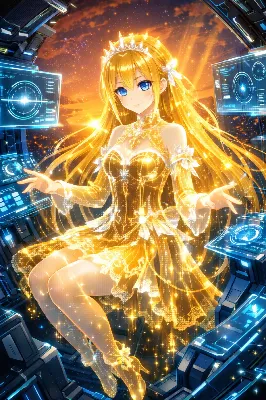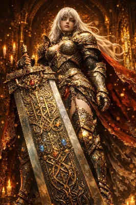 黄金の髪をなびかせ、ピンクのドレスを纏った天使の少女が、光の輪に黒い剣を掲げる。彼女は古の闇を封じる使命を帯び、優しい瞳を閉じて祈りを捧げる。花びらが舞う中、剣先から放たれる光が世界を照らし、希望の物語が始まる。少女の翼が広がり、冒険の幕が開く瞬間を捉えた一枚。読む者の心に、勇気と幻想の風を吹き込む。
