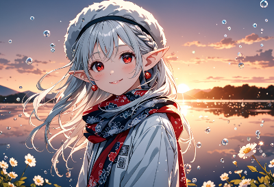 穏やかな湖畔で、白髪の牛娘が仲間たちの牛に囲まれ、優しく微笑む。彼女は森の守護者として、動物たちと心を通わせる特別な力を持つ。今日の午後、水辺で花を摘みながら、遠くから聞こえる不思議な歌声に耳を傾ける。もしかすると、新しい冒険の始まりかも知れない。彼女の赤い瞳が、未来への希望を映し出す瞬間。