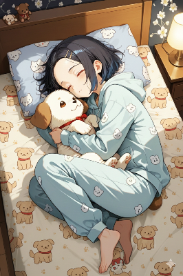 夏の夜、和室の布団に座る少女は、青い浴衣に身を包み、白いクマのぬいぐるみを優しく抱きしめる。窓から差し込む柔らかな月明かりが、彼女の青い瞳を輝かせる。ぬいぐるみは彼女の唯一の友達で、今日の出来事を囁き合う。外の世界は遠く、ここは二人の秘密の時間。もしかすると、ぬいぐるみが動き出す魔法の瞬間が訪れるかも?そんな夢のような日常が、静かに紡がれていく。