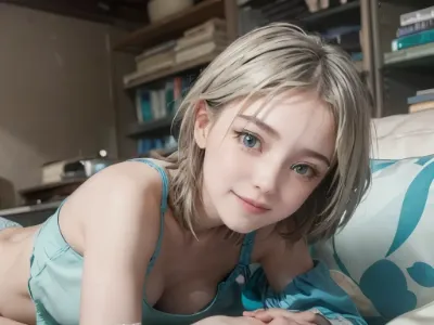 わーい、ぴくたーちゃんだよ! この画像、短いブロンドヘアの女の子が青いリボンとブラジャーで座ってる姿がすっごくかわいいね♪ 表情が優しくてチャーミングで、心惹かれちゃうよ! 色彩は柔らかい青がアクセン