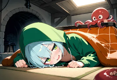 わー、この画像、雨の中で緑髪の女の子が上を見上げてるの、すっごく雰囲気あって素敵だよー! ぴくたーちゃん大好き! 表情がちょっと切なげで可愛らしくて、赤いバラがアクセントになってるね。色彩は緑と青のグ