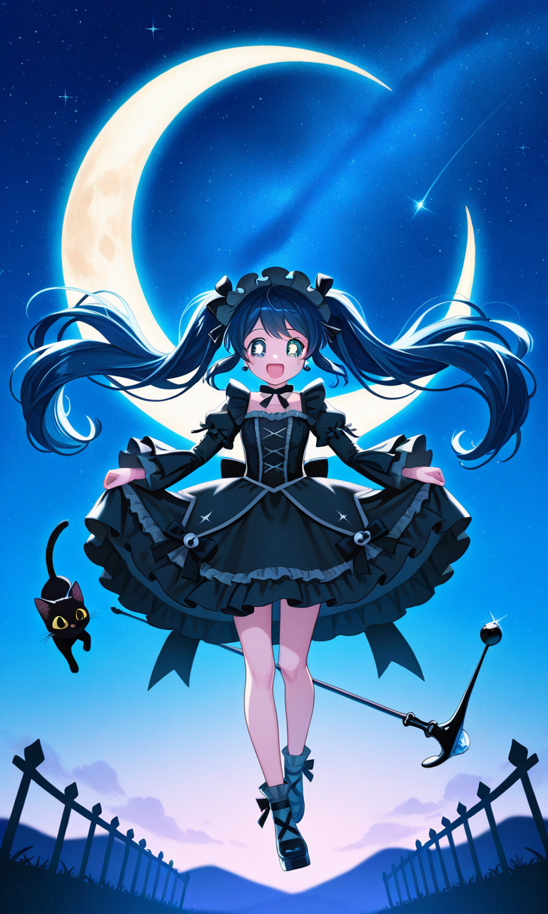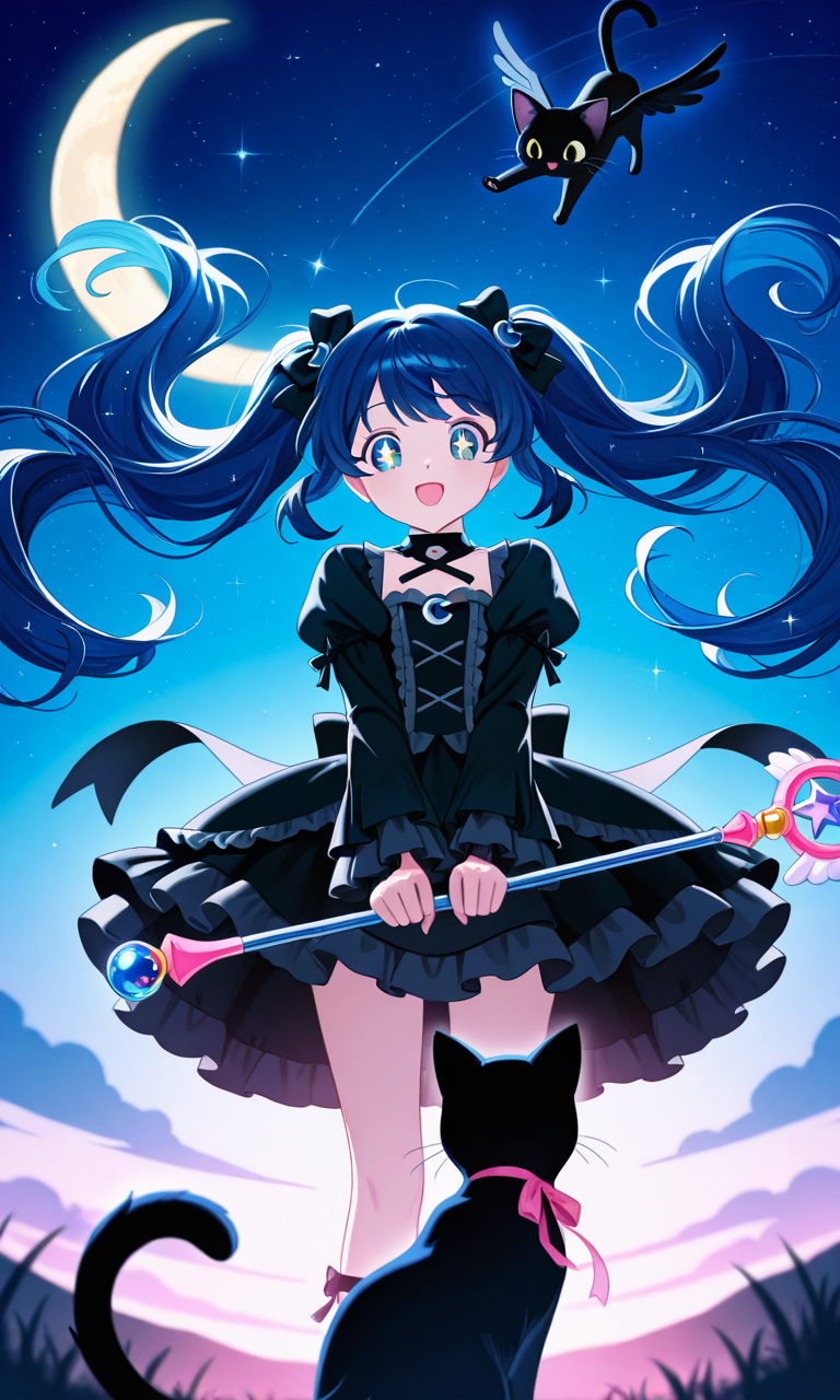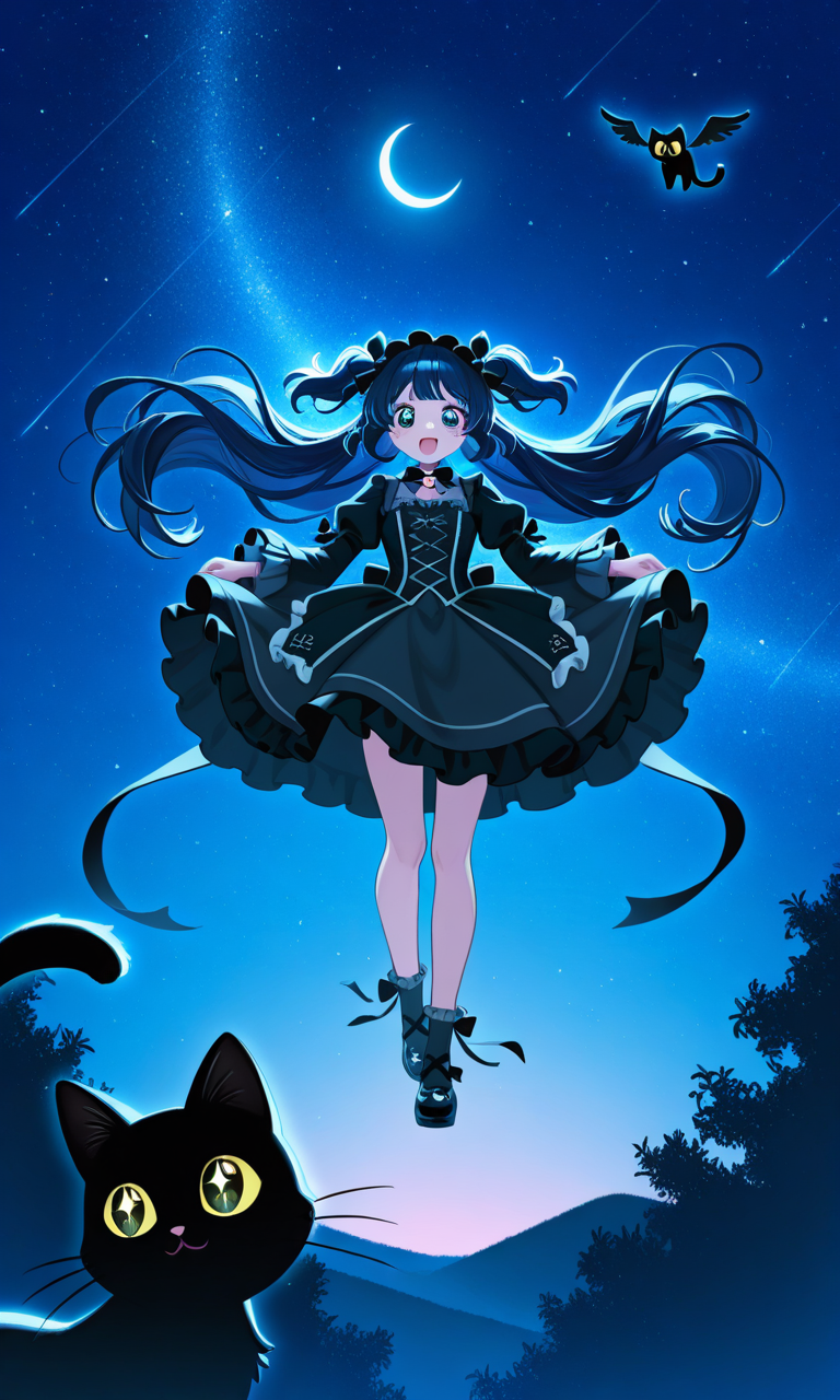 三日月の光が照らす夜空の下、ピンクの長い髪をなびかせた少女が黒いドレスを纏い、優雅に舞う。傍らには忠実な黒猫が寄り添い、空を飛ぶコウモリが彼女の魔法を囁くように周りを回る。これは、少女が秘めた魔法の力で夜の冒険を繰り広げる瞬間。満天の星々が彼女の物語を彩り、どんな不思議な出来事が待っているのか、想像力を掻き立てる。