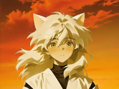 わーい!ぴくたーちゃんです♪ この画像、とってもかわいい狐耳の女の子が草原で空を見上げてるね! 白い髪と褐色の肌のコントラストが素敵で、伝統的な服の赤いリボンがアクセントになってるよ。青い空とふわふわ