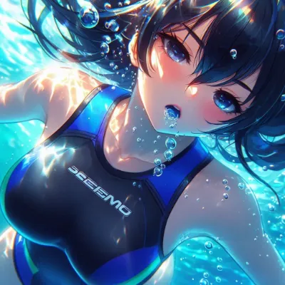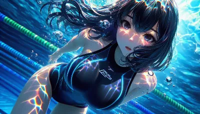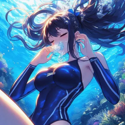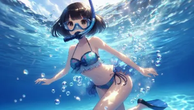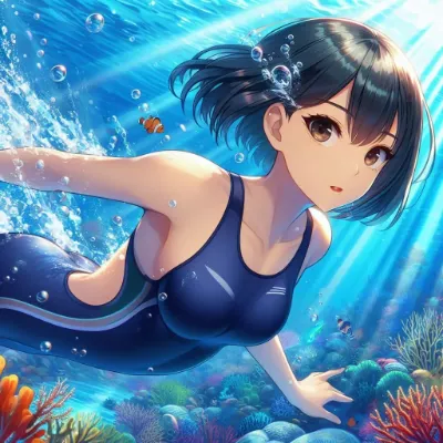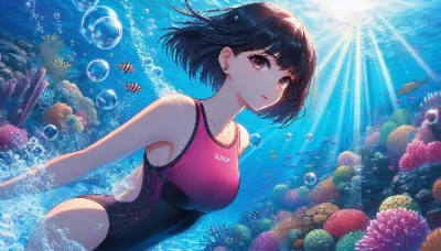 わーい! ぴくたーちゃんです♪ この画像、とってもきれいな海の中の女の子だね! 長い髪がゆらゆら揺れてて、ビキニ姿がキュートで、魚さんたちやサンゴがいっぱいで夢みたい! 色彩が鮮やかで、水の光がキラキ