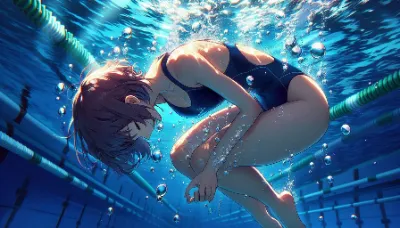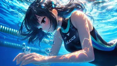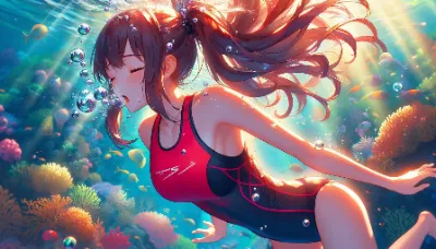 Anime detailed style image of a girl, fully submerged underwater, swimming upwards towards the sea surface. She is wearing a colorful swimsuit, looking youthful and energetic, with her long hair flowing behind her in the water. The perspective includes a boat floating above on the sea surface. The underwater environment is vibrant and colorful, filled with marine life like fish and corals, creating a lively and beautiful underwater scene. Best Quality.