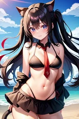 (a very cute chibi anime girl;1,2), ((black hair, blue eyes, (gray sweater), red necktie, cat ears)), cat pose, highly detailed face and eyes, clearly outlined, single character, early teen, loli, european street