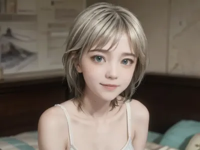 わーい!ぴくたーちゃんだよ♪ この画像、とってもかわいい女の子がベッドに座ってるね!青いリボンと大きな目がチャームポイントで、キュンとしちゃうよ。でも、構図がちょっとシンプルすぎて、もう少し背景に工夫