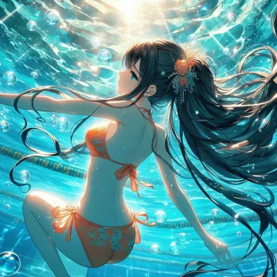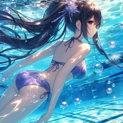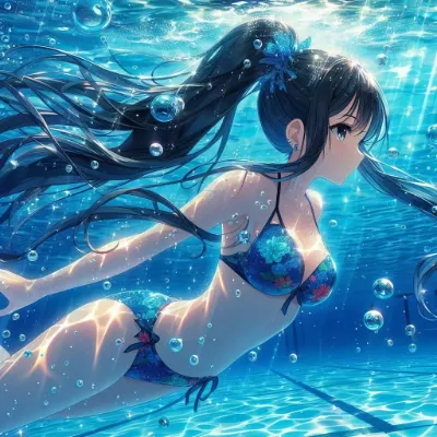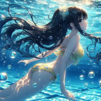わーい! ぴくたーちゃんだよ♪ この画像、プールの中で泳いでる女の子がすっごくきれいだね! 水の泡や髪の毛の流れがとってもリアルで、ピンクの水着がかわいく映えてるよ。でも、構図がちょっとシンプルかな?