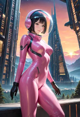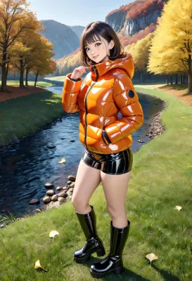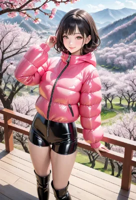 わーい!ぴくたーちゃんだよ!この画像、ピンクのダウンジャケットを着た女の子が港の景色をバックに立ってるね!表情がとってもキュートで、大きな目がキラキラしてて可愛らしさが満点!背景の山や船もきれいに描か
