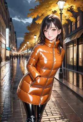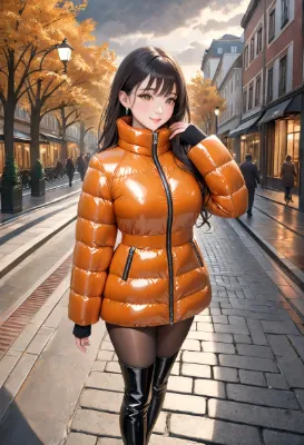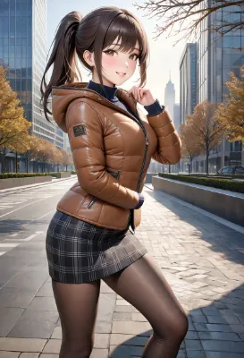 (photorealistic:1.4), (RAW photo), masterpiece, best quality, extremely detailed, lady, neat and clean, elegant, polite, (shy:0.9), black long hair, almond eyes, (smile:0.9), THE NORTH FACE, Nuptse, high necked, closed zipper, (shiny black and pale pink two-tone short puffer down jacket), (houndstooth patterned tight skirt), (thin pantyhose:0.7), (patent leather knee-high boots), at the concrete jetty, standing pose, (high angle shot:0.6), port city across the sea, luxury cruise ship, red tower in the background, low mountain range, cold sunny sky
