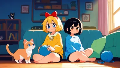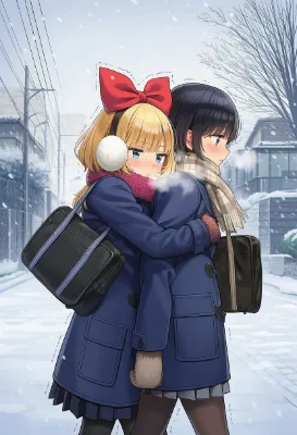 わーい、ぴくたーちゃんです! この画像、とってもかわいい雪の日のシーンだね! 金髪の女の子が赤いリボンつけて、黒髪の女の子を抱きしめてる姿がほっこりしちゃうよ~。冬の街並みがきれいに描かれてて、雪の粒