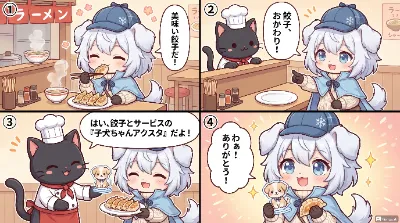 キラキラのフレグランスミストで気分転換!アクアちゃんとペロちゃんが、大好きなラーメンを囲んで笑顔を届ける、ハッピー全開な四コマ漫画です!