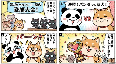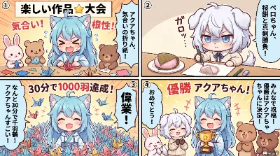 わーい!ぴくたーちゃんだよ!この4コマ漫画みたいな画像、青髪の猫耳ちゃんたちがパーティーポッパーで遊んでる姿が超かわいいね!ウサギさんのぬいぐるみも加わって、ほんわかしたお部屋のシーンが楽しいよ♪ 表