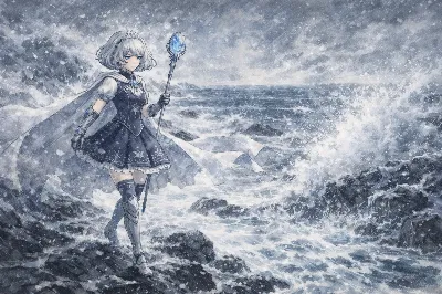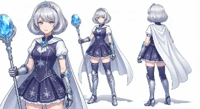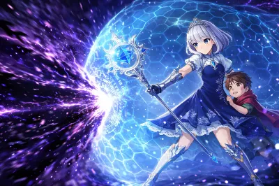わーい、ぴくたーちゃんだよ! この画像、銀髪の女の子がクリスタルみたいな翼を広げて、青いエネルギーボールがいっぱい浮かんでるね! かっこよくてクールな感じがすっごく出てるよ♪ 可愛らしさはあの赤い目と
