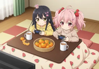 「はい、鏡餅~♪ どうよ、目ぇ離せないでしょー♡」 ――― 多分にネタ被りはしそうですが、こういうのしか思いつかなかったんですよ← 因みに一応どうにか「横になった状態で重なったお胸様にみかんを乗せる」が出来ないか模索しましたが、私のプロンプト構築力ではできませんでした(笑) そしてある程度キャラを固定化しようとは考えていて、手元に「この娘はこう」みたいなベースプロンプトをメモしてあるのですが、金髪ツインテールちゃんは赤目と碧眼でブレていたので碧眼ちゃんはおっきい娘として分離させることにしました。 クロ「ツインテの長さは固定していないようだけどね」 ――― みかん少女の甘い休日 陽光が差し込む部屋で、金髪の少女がピンクの部屋着に身を包み、みかんを胸にのせて微笑む。彼女の日常は、果物の甘い香りに満ちた冒険のよう。ボウルから一つ取っては、いたずらっぽく遊ぶ姿に、誰もが心奪われる。もしかすると、このみかんは秘密のメッセージ? 彼女の物語は、甘酸っぱい瞬間から始まる。