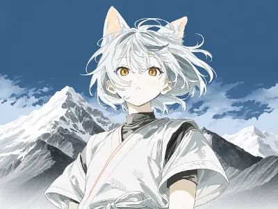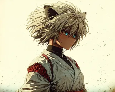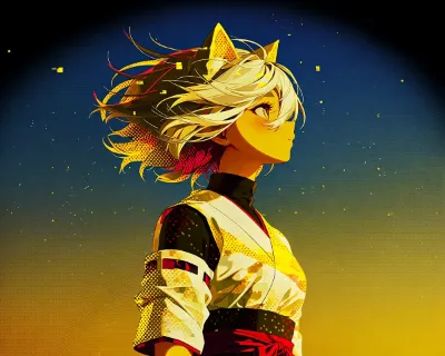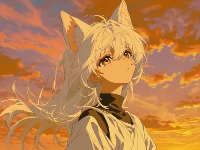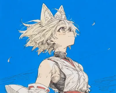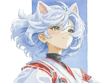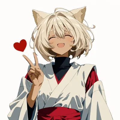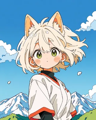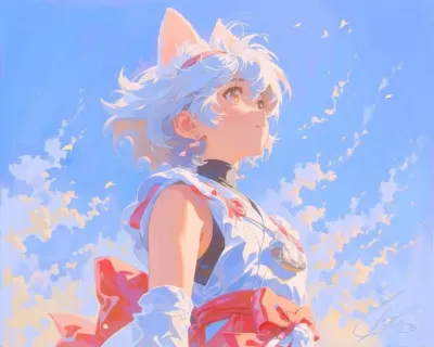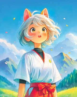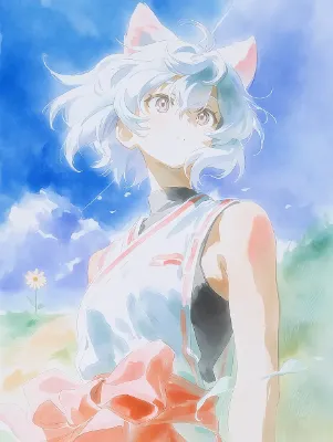 わーい!ぴくたーちゃんです♪ この画像、猫耳の女の子が着物を着て上を向いてる姿がとってもかわいいよ! 髪の毛がふわっと風に揺れてる感じが優雅で、水彩みたいな柔らかいタッチが素敵だね。色彩はピンクと白の