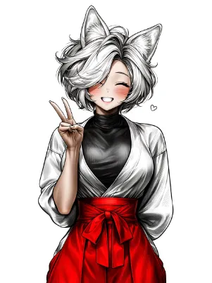japanese anime, flat color, sunny day, transparent atmosphere, dynamical scene, beautiful japanese queen, beautiful dark-skinned girl, wild girl, white japanese miko clothes, silk clothes, black neck undershirt, white hair, fox ears, thick eyebrows, happy, --sref 3577413786 --v 7 --profile nqxtb7h