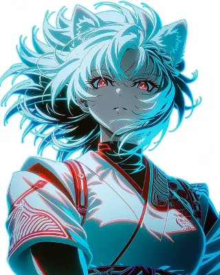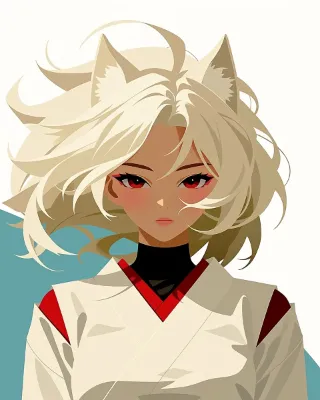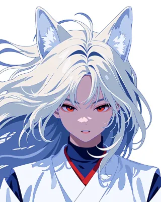 japanese anime, flat color, sunny day, transparent atmosphere, dynamical scene, beautiful japanese queen, beautiful dark-skinned girl, wild girl, white japanese miko clothes, silk clothes, black neck undershirt, white hair, fox ears, thick eyebrows, happy, --sref 3577913782 --v 7 --profile nqxtb7h