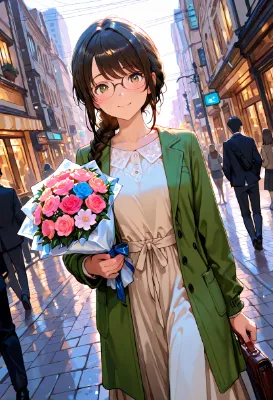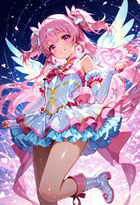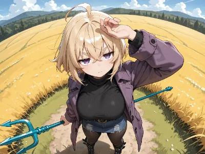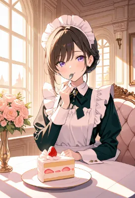わあ、この画像、とっても素敵ですね! 馬に乗った女の子が弓を射る姿が、伝統的な日本の神社を背景に描かれていて、まるで冒険の物語の一場面みたい。女の子の長い髪が風になびいているのが可愛らしくて、青い瞳が