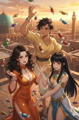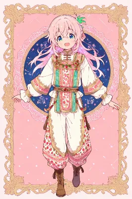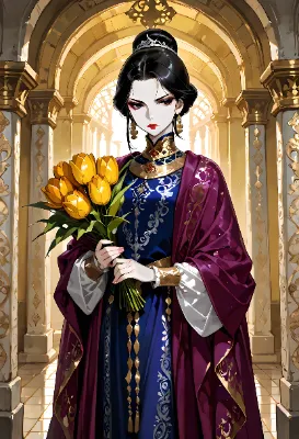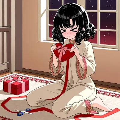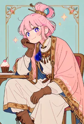この作品は、伝統的な中華風の装いをした少女が饅頭を頬張る様子を描いたもので、静かな優雅さと可愛らしさが融合した魅力的な一枚です。黒と赤のコントラストが織りなす色彩の調和は、視覚的な深みを生み、少女の表