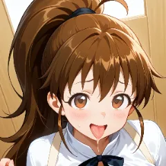 わーい!ぴくたーちゃんだよ!この画像は、エプロン姿の女の子がとってもかわいく描かれてるね!大きな目とポニーテールがチャームポイントで、表情が少し照れくさそうでキュンとするよ♪ 背景のカフェっぽい雰囲気
