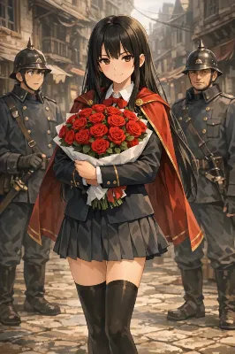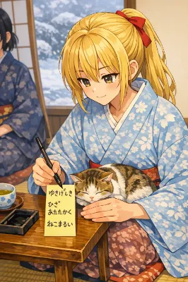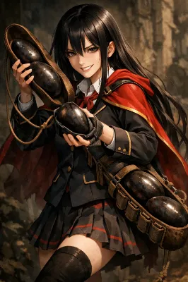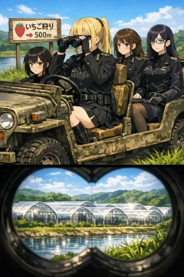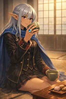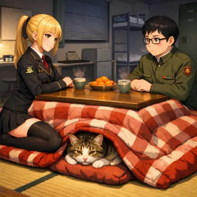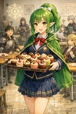 真冬の夜、学院の広場に設置された小さな屋台の前。雪がしんしんと舞い落ち、屋台の湯気と光が幻想的に揺れていた。 シャーリーは、いつもの黒髪ロングを揺らしながら、フォークとナイフで肉まんを切り分け、まるで高級レストランのデザートを楽しむかのように慎重に口に運ぶ。 「……ふふ、やはり上品にいただくのがよろしいですね」 普段は三下キャラなのに、その仕草は思いのほか優雅で、見る者の目を引く。 その隣で、アーゼリンは神秘的な大人の美女。ダークエルフの長身で日焼けした肌に銀髪を揺らし、マントを翻しながら手にした肉まんをにかぶりつく。 それでいてそこはかとなく上品。 「こんな夜は、肉まんに限るだろう?」 その表情はまるで最高級のワインを味わうように誇らしげで、堂々とした美しさに溢れていた。 シャーリーは一瞬、所作を止めてアーゼリンを見つめる。 「……やっぱり肉まんはこうやって食べるのが一番でござるな」 フォークとナイフをそっと置き、両手で肉まんを掴む。年相応さ?と大人びた美しさが混ざり合った、ちょっとコミカルな姿になった。 そこへ、緑髪ポニーテールのチェルキーが駆け寄る。 「ほら、楽しんで食べればいいんだよ!」 小柄で可憐な姿だが、生命力と精神力は大人並み。彼女の笑顔に、二人は思わず安心して微笑む。 雪の舞う夜、屋台の前で湯気立つ肉まんを頬張る三人。 上品も豪快も、年齢も性格も関係ない―― 暖かく、幸せで、幻想的な冬のひとときがそこにあった。