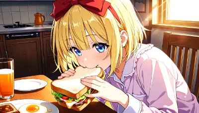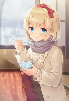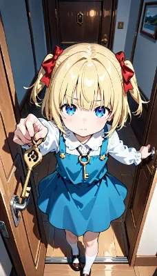 わーい! この画像、とってもかわいい女の子がドアの前に立ってるよ! 金髪に赤いリボンがぴょんって跳ねてて、赤いコートとマフラー、ミトンが冬っぽくてほっこりしちゃうね♪ 表情がにこにこで、大きな青い目が