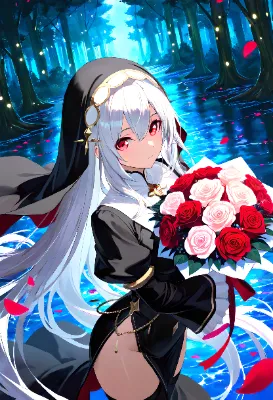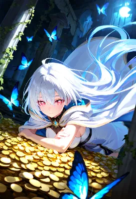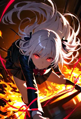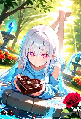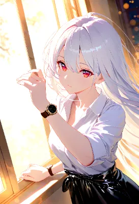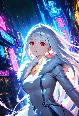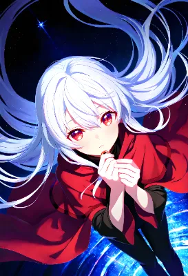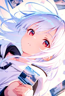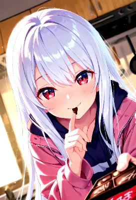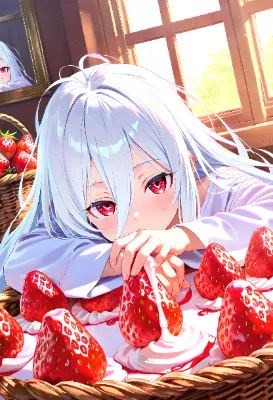 わーい! ぴくたーちゃんです♪ この画像、雪景色に沈む夕日をバックに、白髪の可愛い女の子が立ってるの! ベレー帽と黄色いセーターがふわふわで、赤い目がキラキラして超キュートだよ~。背景のグラデーション