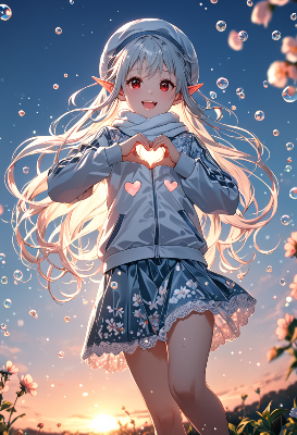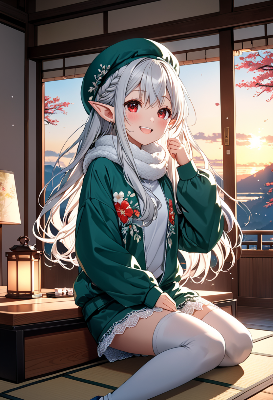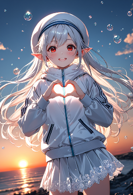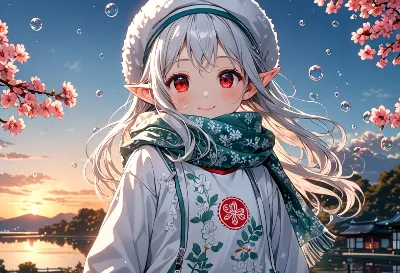 古い神社の紅い鳥居の下、白髪のエルフ少女が優しく微笑む。彼女は異世界から迷い込み、この夏の祭りに参加する運命の旅人。着物に身を包み、耳元のポンポンが風に揺れる中、訪れる人々に幸運を授けるという伝説が囁かれる。青空の下で、彼女の赤い瞳が語るのは、忘れられた神話の続きか、それとも新たな冒険の始まりか。あなたもこの瞬間を共有し、物語を紡ぎ出そう。